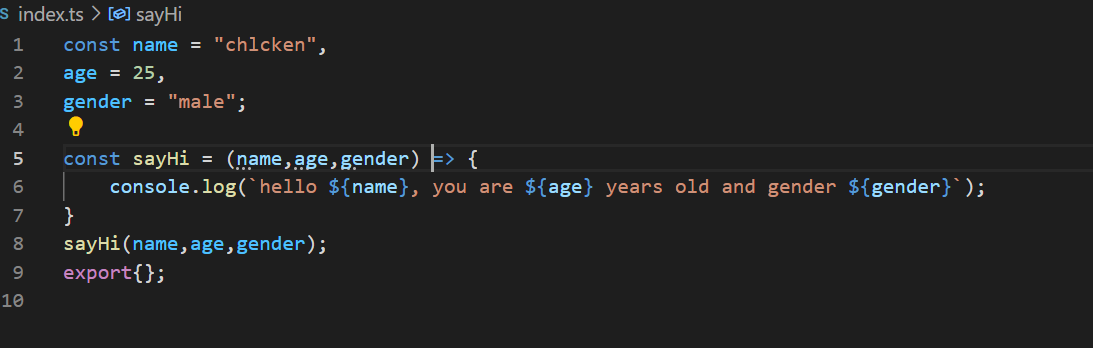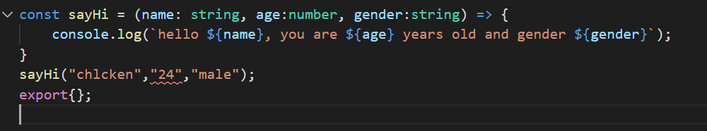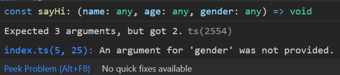 그러나 우리가 작업을 하다가 실수로gender를 빼먹고 sayHi(name, age);라고 선언을 한다면 어떻게 될까?