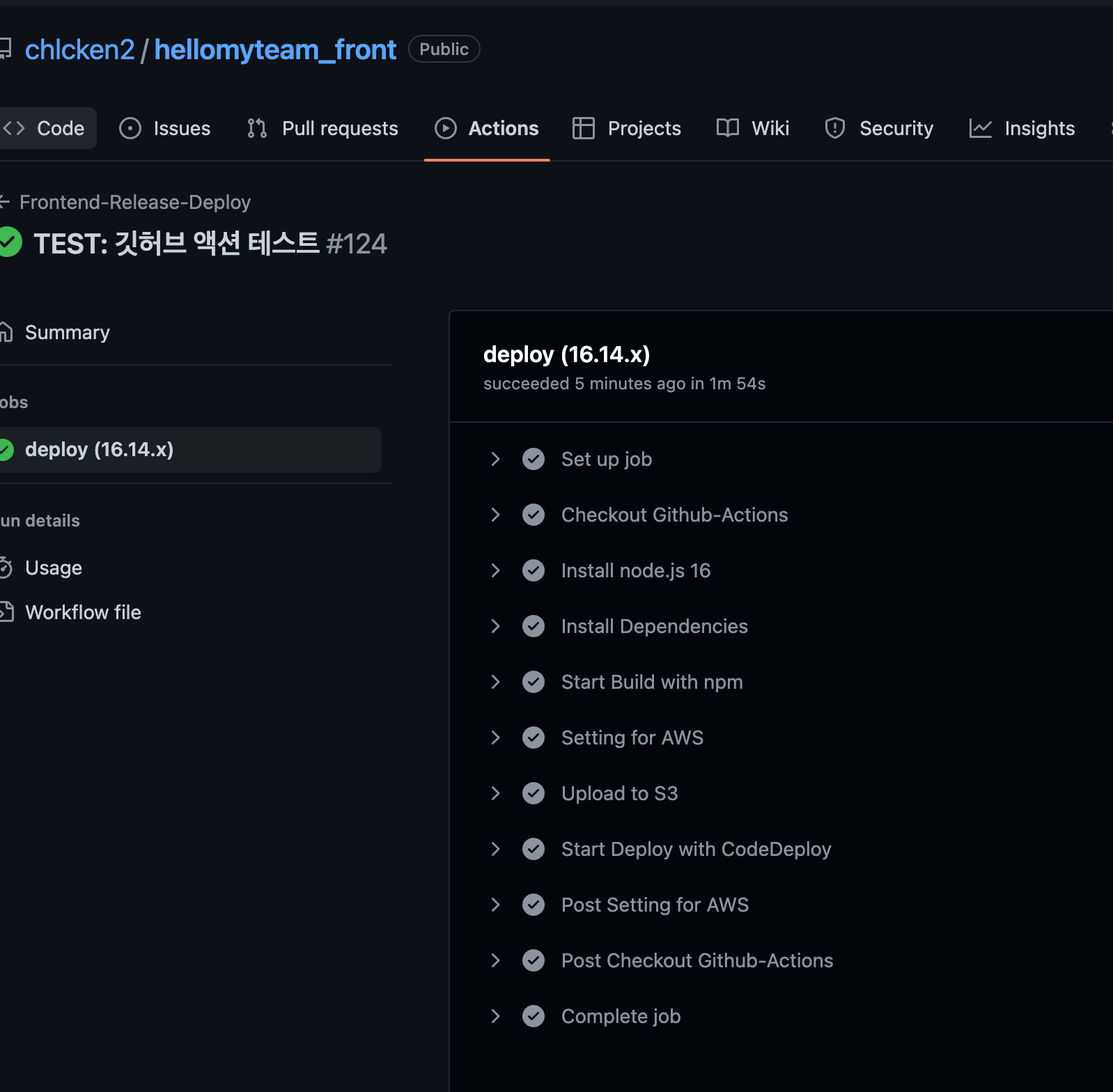 하지만 프런트의 깃허브 액션은 예제를 찾아보며 구성해도 계속해서 오류가 났다.