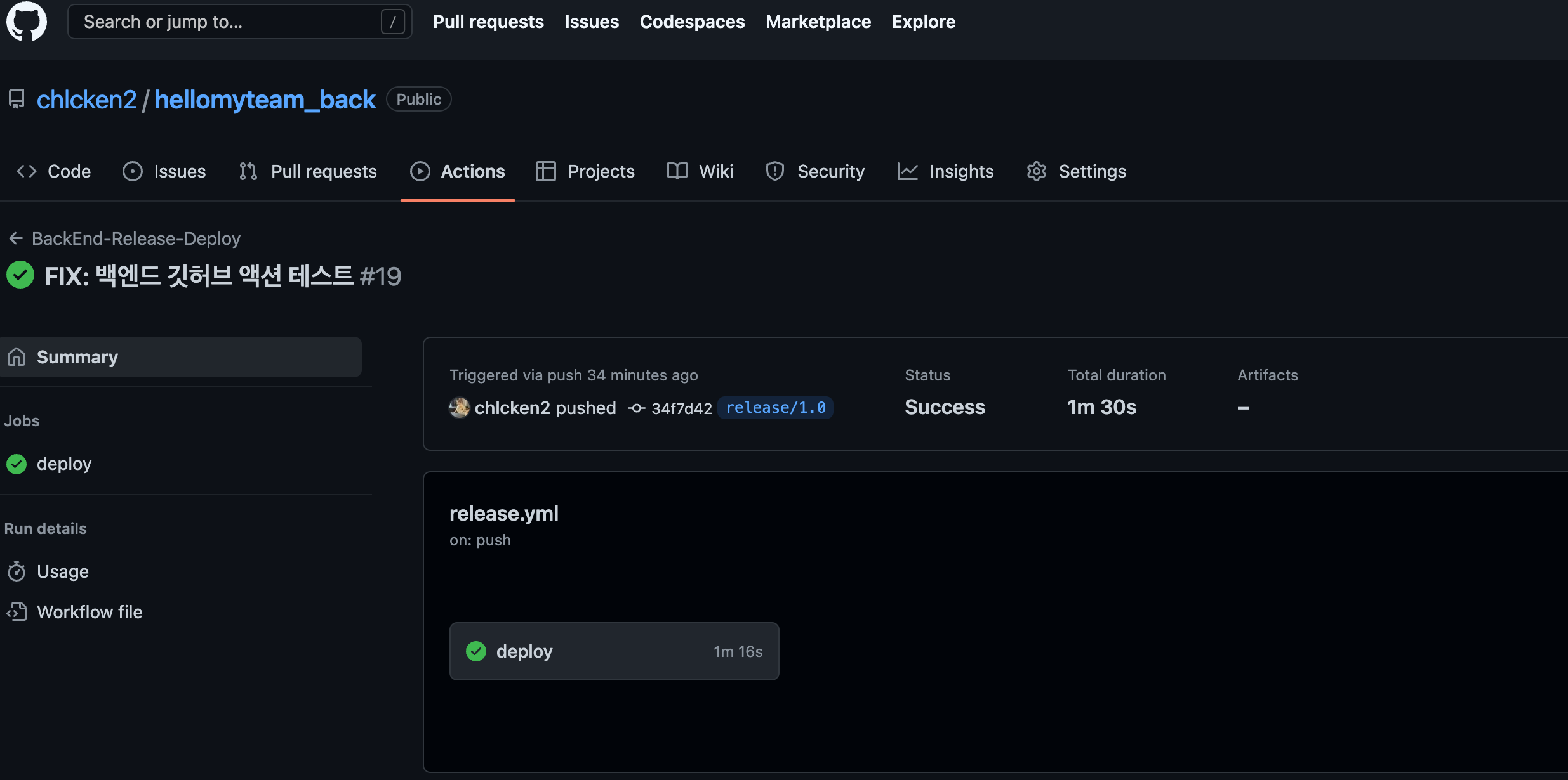 깃허브 액션으로 백엔드와 프런트엔드 적용한 모습