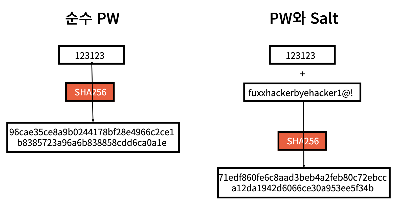 유저가 회원가입 시 입력한 PW + 특정 문자열(salt)을 조합 -> SHA256 알고리즘을 통해 해시함수로 만드는 것이다.