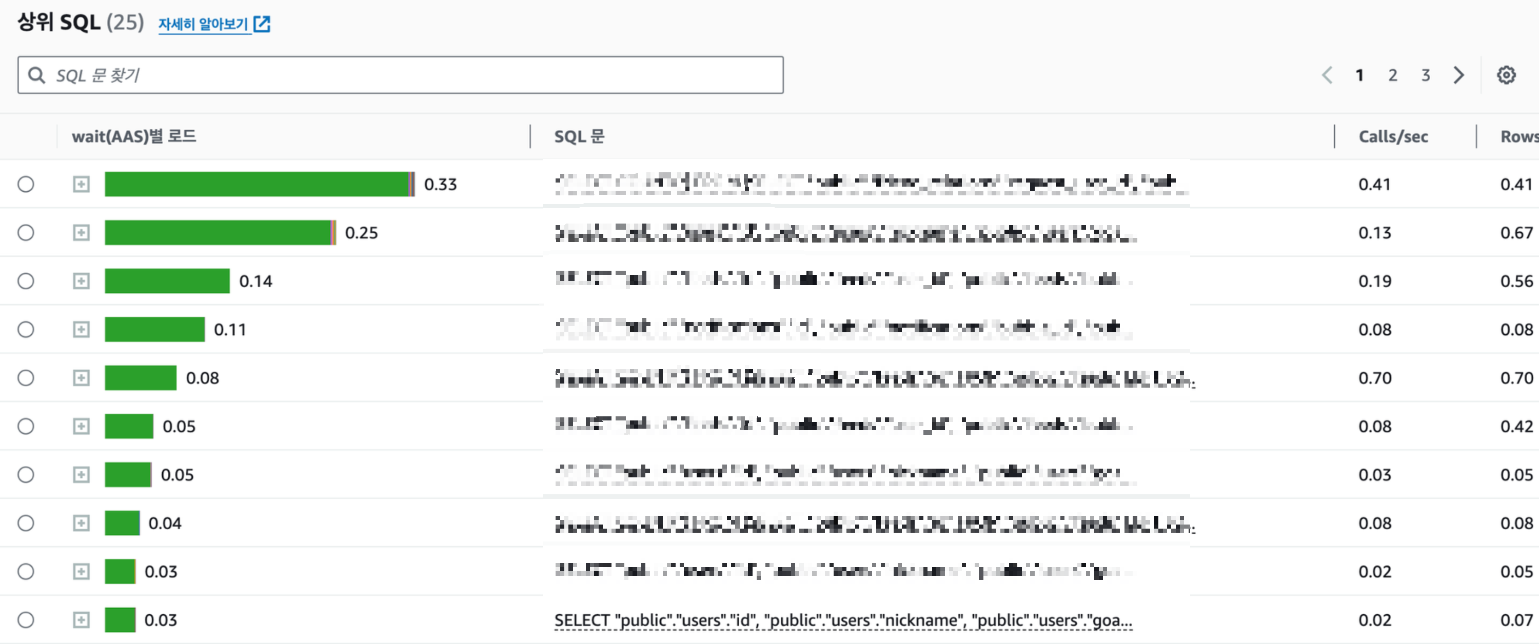 그다음 AWS RDS 모니터링 서비스에서 속도가 느린 쿼리를 체크했다.
