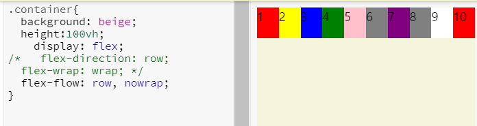 1. flex-wrap: nowrap ▶ 기본값 nowrap, 사이즈를 줄일 경우 사이즈가 줄어든다(찌부된다고 이해하면 쉬움)
