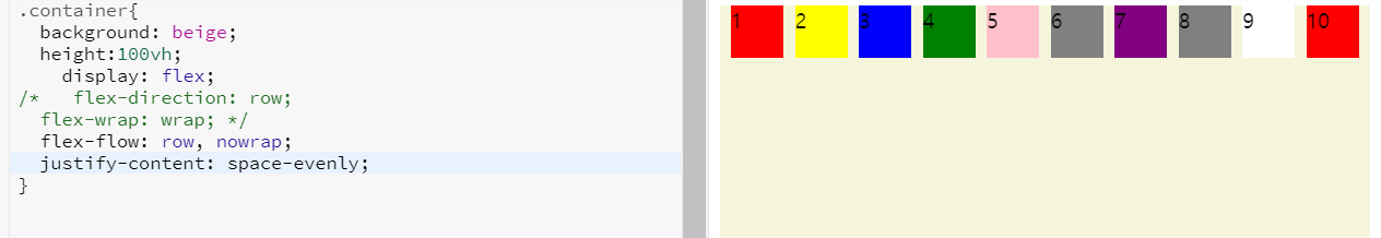 5. justify-content: space-evenly 각 박스마다 동일한 spacing이 들어가 있다. ▶ 1번과 10번도 똑같이 떨어짐