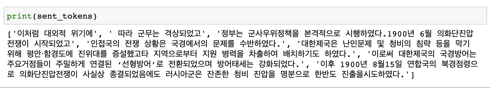 sent_tokens = ['이처럼 대외적 위기에',' 따라 군무는 격상되었고', '정부는 군사우위정책을 본격적으로 시행하였다.1900년 6월 의화단진압 전쟁이 시작되었고', '인접국의 전쟁 상황은 국경에서의 문제를 수반하였다.', '대한제국은 난민문제 및 청비의 침략 등을 막기 위해 평안・함경도에 진위대를 증설했고타 지역으로부터 지원 병력을 차출하여 배치하기도 하였다.', '이로써 대한제국의 국경방어는 주요거점들이 주밀하게 연결된 ‘선형방어’로 전환되었으며 방어태세는 강화되었다.', '이후 1900년 8월15일 연합국의 북경점령으로 의화단진압전쟁이 사실상 종결되었음에도 러시아군은 잔존한 청비 진압을 명분으로 한반도 진출을시도하였다.']